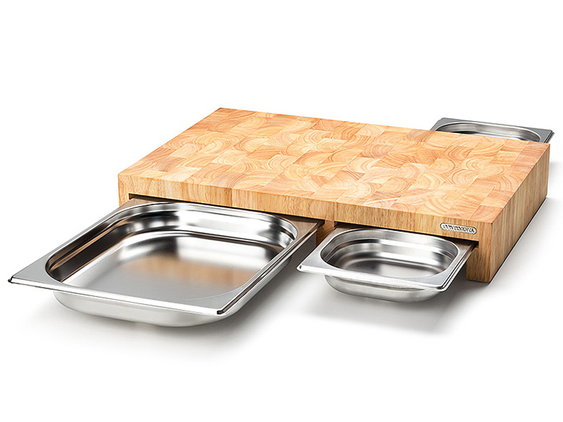 Krájecí deska z kvalitního tvrdého dřeva s nerezovými zásuvkami.