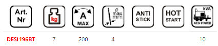 Invertorová svářečka DEDRA DESI196BT je určena pro obloukové svařování MMA obalenými elektrodami o maximálním průměru 4 mm a maximálním svařovacím proudem 200 A. S jeho pomocí můžete svařovat takové materiály, jako jsou legované oceli, konstrukční oceli a litiny.
