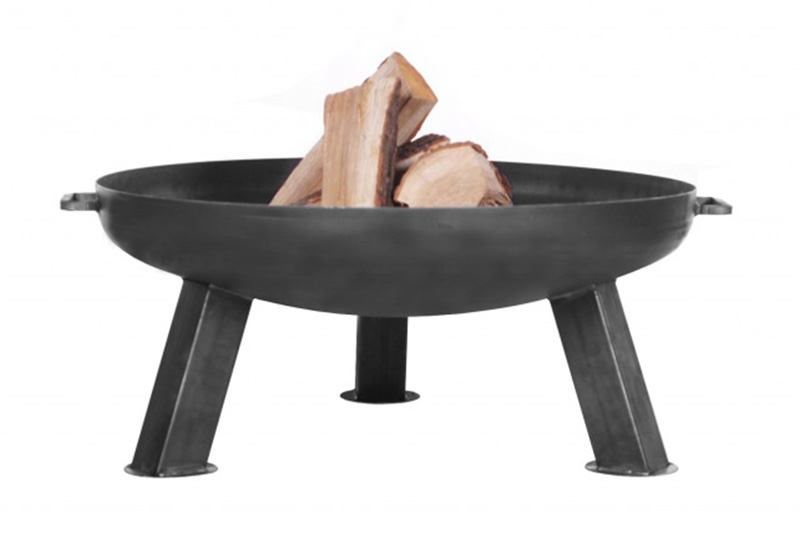 Vyšší kovové ohniště s lisovaným dnem, třemi hranatými nožkami a madly pro snadné přenášení. Ohniště na dřevo pro otevřený oheň na zahradě.