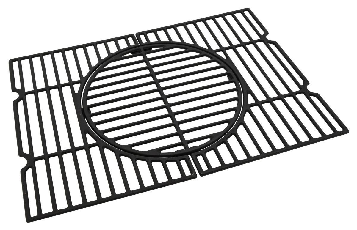 Litinový rošt s třídílnou konstrukcí s celkovými rozměry 58 x 42 cm se středovou částí o průměru 31 cm.