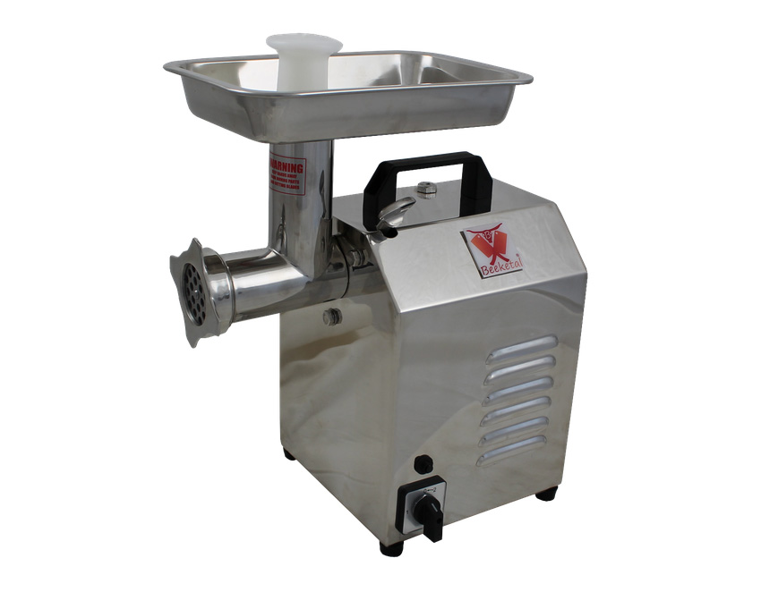 Elektrický řeznický mlýnek na maso Beeketal FW735 - profi maso mlýnek, masový mlýnek splňuje normy CE a HACCP, tělo mlýnku na maso, šnek, složení a převlečná matice jsou z nerezové oceli (pozor konkurenční mlýnky mívají vnitřní složení pouze z hliníku nebo normálního železa). 3 děrované desky o průměru 3 mm, 5 mm a 8 mm + 2 nože. Mlýnek s plastovou plničkou na klobásy, uzeniny a vinné klobásy, chlazení motoru pro vyšší výkon. Ideální pro řezníky, gastronomie, velké kuchyně.