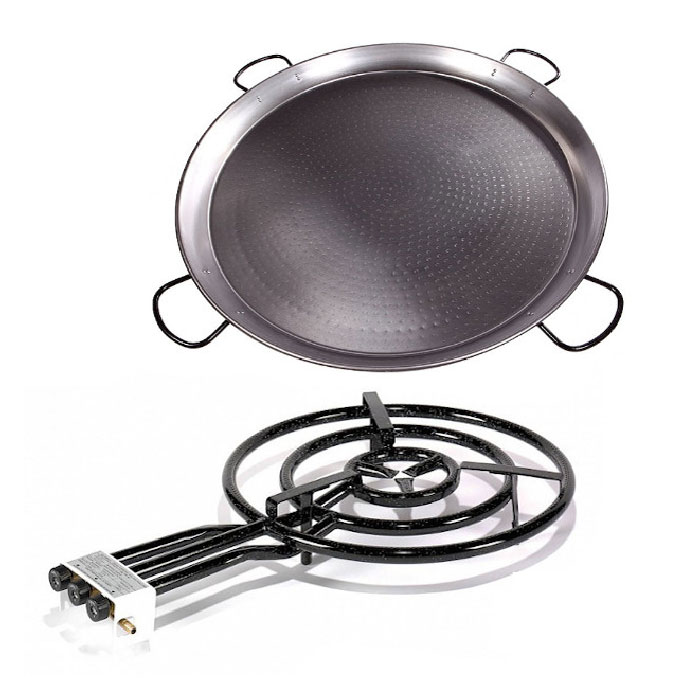 Velký gastro set velkoplošného Paella hořáku Ø 60 cm, 3-kruhového, společně s leštěnou ocelovou Paella pánví Ø 80 cm. Tradiční pánev a propan-butanový hořák pro přípravu jídla Paella, vhodné také další speciality, které je možno připravovat ve velkém množství na pánvi: Rizoto, brambory s cibulí / zelí s klobásou, polský bigos, fazole, Chilli con carne a spoustu dalších pochoutek.