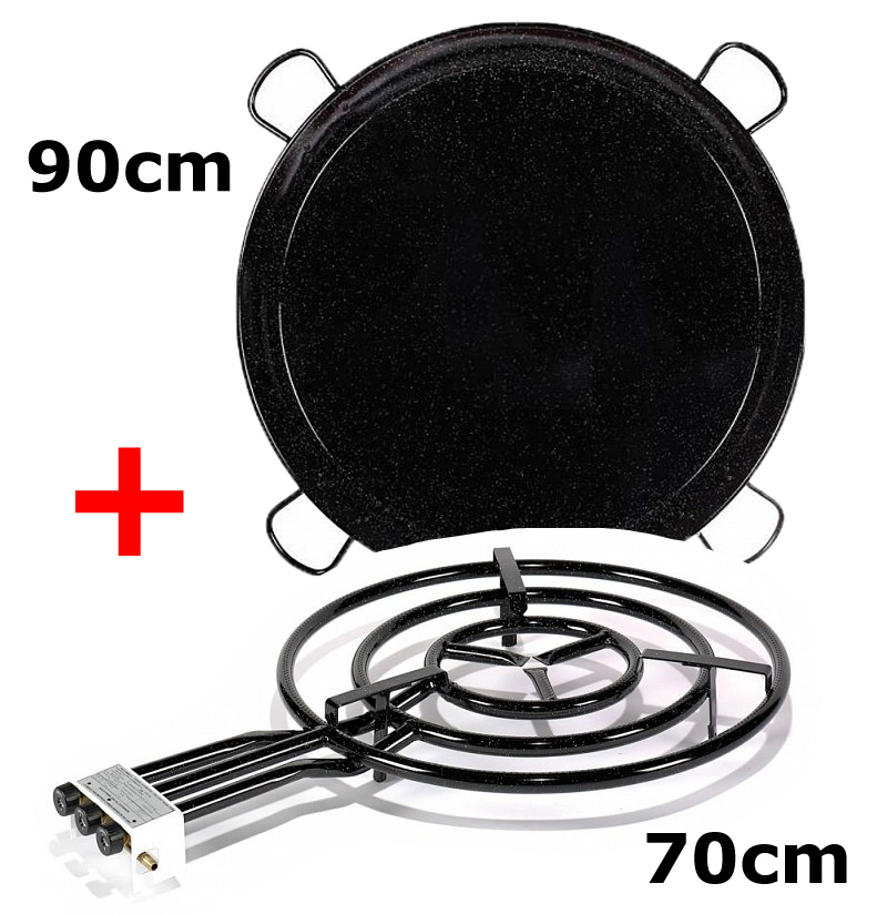 Velký gastro set velkoplošného Paella hořáku Ø 70 cm, 3-kruhového společně se smaltovanou Paella pánví Ø 90 cm. Tradiční pánev a propan-butanový hořák pro přípravu jídla Paella, vhodné také další speciality, které je možno připravovat ve velkém množství na pánvi: Rizoto, brambory s cibulí / zelí s klobásou, polský bigos, fazole, Chilli con carne a spoustu dalších pochoutek.
