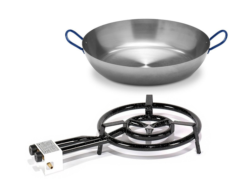 Střední gastro set velkoplošného, 2-okruhového Paella hořáku Ø 40 cm, společně s vysokou ocelovou leštěnou Paella pánví Ø 60 cm. NOVÁ vysoká pánev LYONESA a propan-butanový hořák pro přípravu jídla Paella, vhodné také další speciality, které je možno připravovat ve velkém množství na pánvi: Rizoto, brambory s cibulí / zelí s klobásou, polský bigos, fazole, Chilli con carne a spoustu dalších pochoutek.
