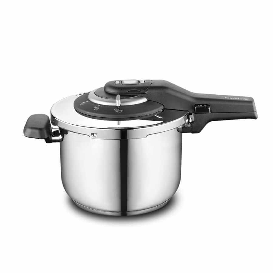 Vaříte rádi zdravě, rychle a levně? Tlakové hrnce vyrobené z kvalitní nerezové oceli Vám toto umožní. Díky silnému sendvičovému dnu je můžete používat na všechny typy varných desek, včetně indukce. Vařením v tlakovém hrnci dále výrazně snížíte dobu vaření a tím i spotřebu elektrické energie. Krátké vaření při vyšší teplotě ponechává potravinám vyšší obsah původních teplem nerozložených vitamínů a dalších látek. Tlakový hrnec o objemu 6 litrů má jednoduchý bajonetový uzávěr, lehce se otevírá, je vybaven masivními úchyty pro snadnou manipulaci a třemi pojistkami pro bezpečné použití. Užitečný pomocník je také nastavitelný časovač, displej s ukazatelem času.