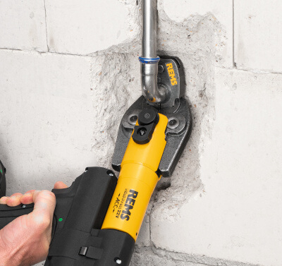 Lisovací kroužek se 2 lisovacími čelistmi, pro bezpečné nasazení lisovacích čelistí na špatně přístupných místech díky šikmé poloze v úhlu 90°). K pohonu REMS lisovacích kroužků 90° (PR-2B) jsou nutné mezikleště.