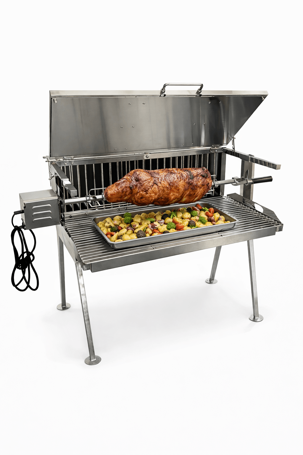- Nastavitelné víko: Zahrnuje nerezové víko, které je nastavitelné a zajišťuje lepší propečení masa na rotiserii.